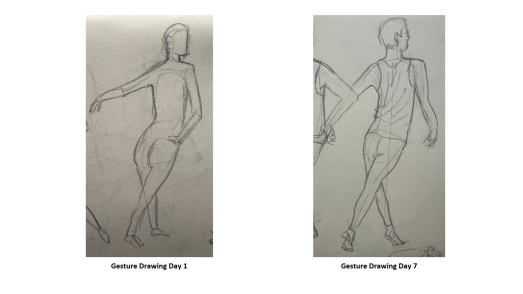 我本來以為自己毫無進步,但是今天在畫上圖這個姿勢時,我想起來之前好像有練過類似的!於是把畫本往回翻頁,看了一下日期註記--上次畫這個姿勢是7天前。